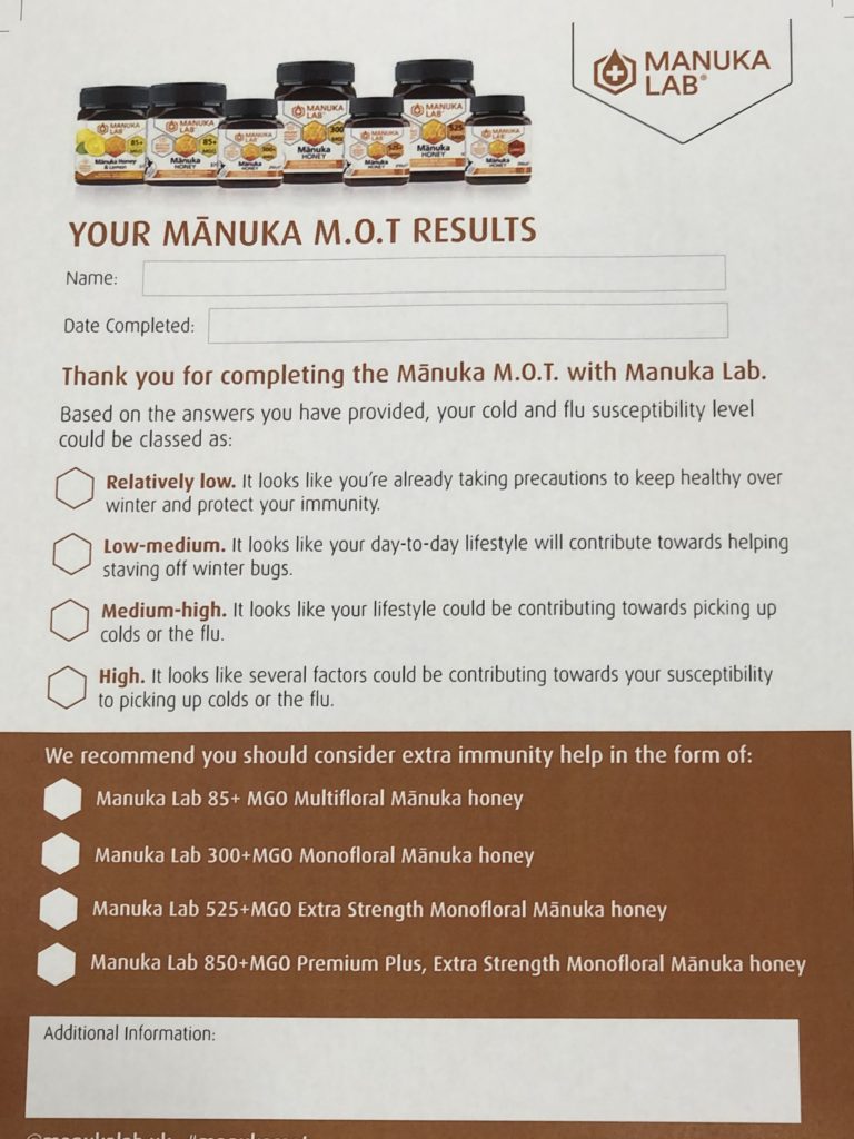As the days get darker and the temperatures drop, it is not uncommon to pick up that cold, however Manuka Honey can help to reduce the chances of catching it. Manuka Lab have created a quiz to determine which MGO strength is most beneficial for you. Check out their quiz here.