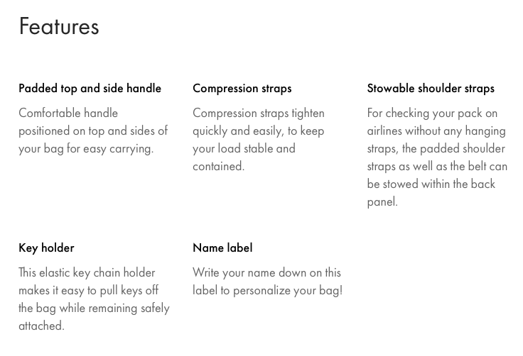 • Handles – There are handles on all sides of the bag, meaning it’s easy to lift and carry, with multiple choices. You can also attach items and clip on a water bottle for example, to these durable seat-belt style handles. They are strong and handy.