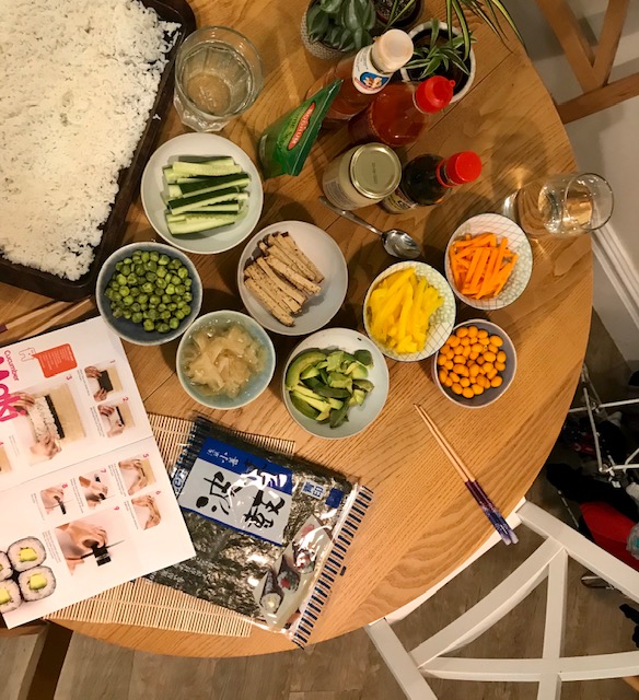 As we’re vegan, we adapted the recipes using smoked tofu, avocado, carrots, peppers, cucumber and vegan mayo alongside the recommended ginger, soy sauce and sesame seeds.