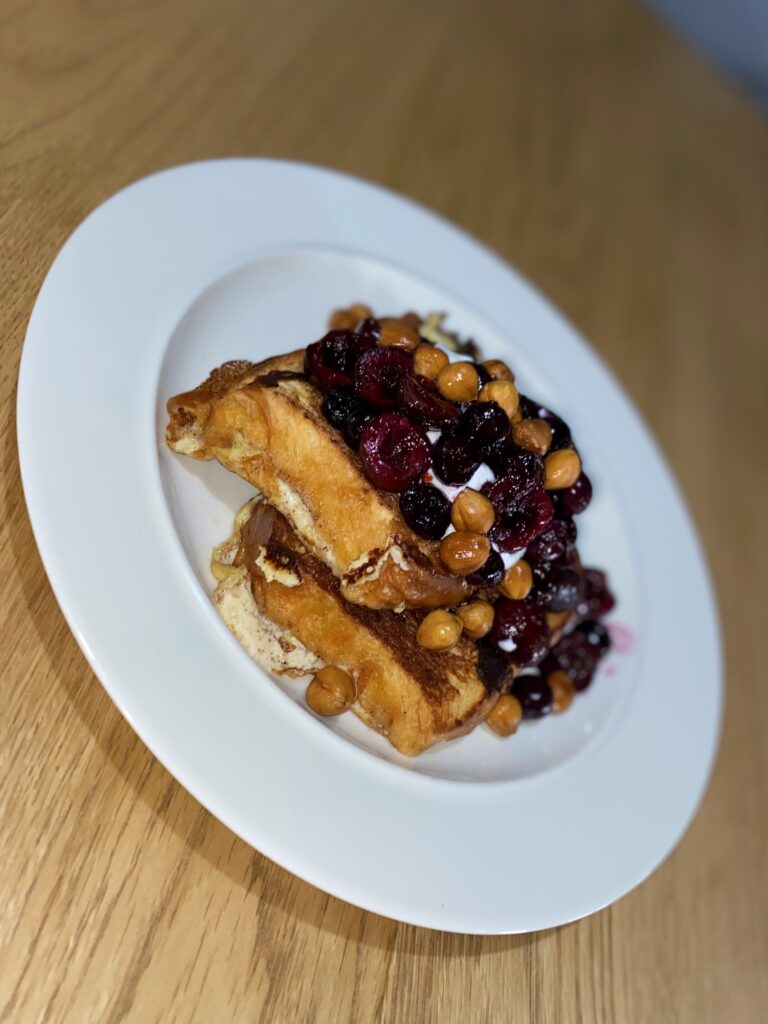 The first recipe we tried was Huevos Rancheros and the second was French Toast. I was unable to find the nectarines recommended for the French Toast so opted for blueberries and cherries, but you could pretty much use whatever fruit topping you wanted.